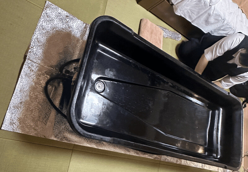 畳の部屋でどうするのかと思っていたら、巨大な浅いバスタブが登場しました。